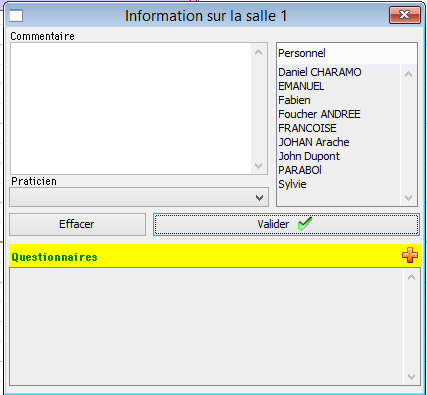 La fenêtre Personnel recense les codes utilisateur déclarés comme travaillant au bloc dans leur profil. Pour faire apparaitre un nom de personne dans l'entête, il suffit de glisser le nom choisi dans la zone Commentaire. Il est possible d'y ajouter du texte. La zone Praticien liste les praticiens déclarés dans OSOFT. Le bouton Effacer permet d'enlever le praticien sélectionné dans la liste. Enfin, la partie basse de l'écran, grace au |
