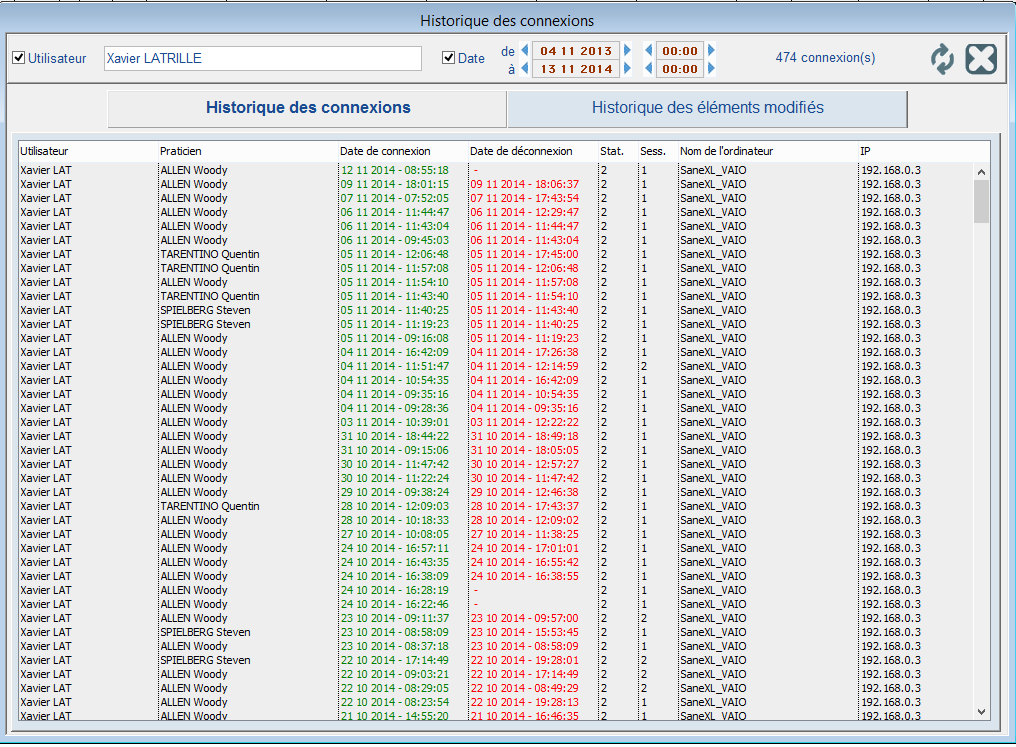 Cet écran permet d'identifier les différentes connexions ayant eues lieu en fonction des filtres sélectionnés. A l'ouverture, les cases à cocher "Utilisateur" et "Date" sont activées. Ceci permet de rechercher, sur la période (date et heure) les différentes connexions de l'utilisateur sélectionné. Désactiver "Utilisateur" revient à rechercher, sur la période, les connexions de tous les utilisateurs. Désactiver "Date", revient à rechercher toutes les connexions de l'utilisateur sélectionné. Une recherche en désactivant les deux cases à cocher n'a pas de sens et peut durer un long moment. Chaque ligne indique : L'utilisateur, le praticien sélectionné (le premier de la liste dans le cas d'un soignant), les dates et heures de début et fin, le numéro de la station, celui de la session, le nom de l'ordinateur et son adresse IP |
